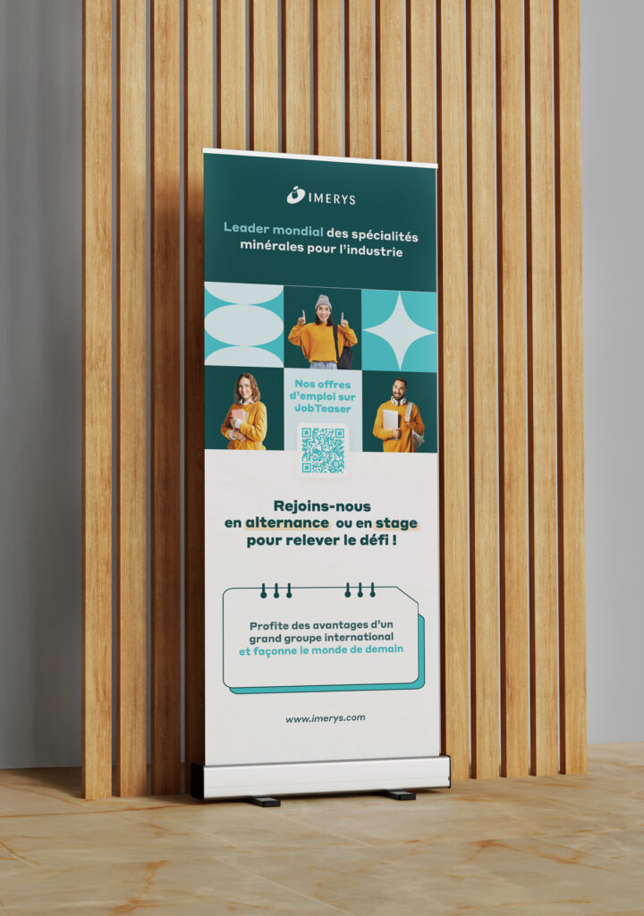 Nous avons accompagné Imerys dans la réflexion autour de sa marque employeur, avec la création de deux kakémonos dédiés aux salons étudiants. Ce projet, bien que non concrétisé, illustre notre approche pour développer la marque employeur des entreprises.