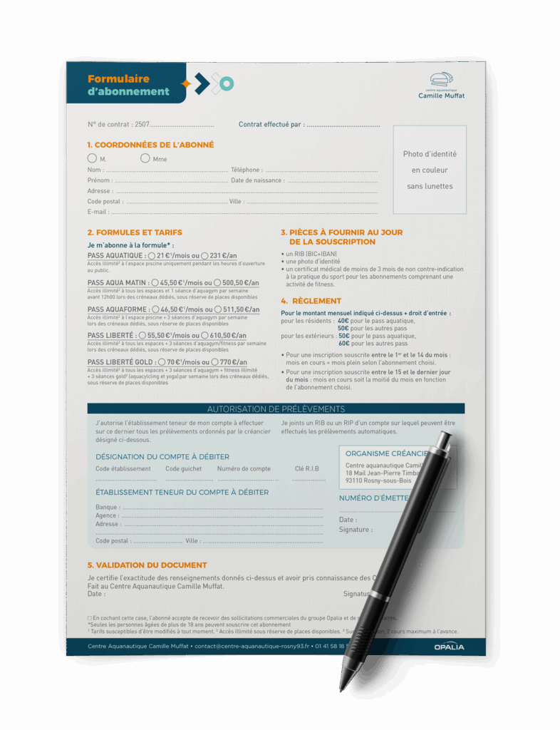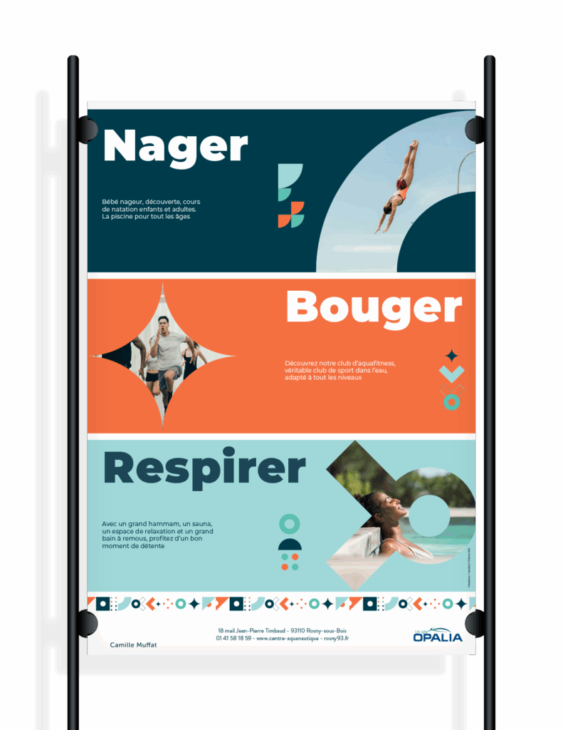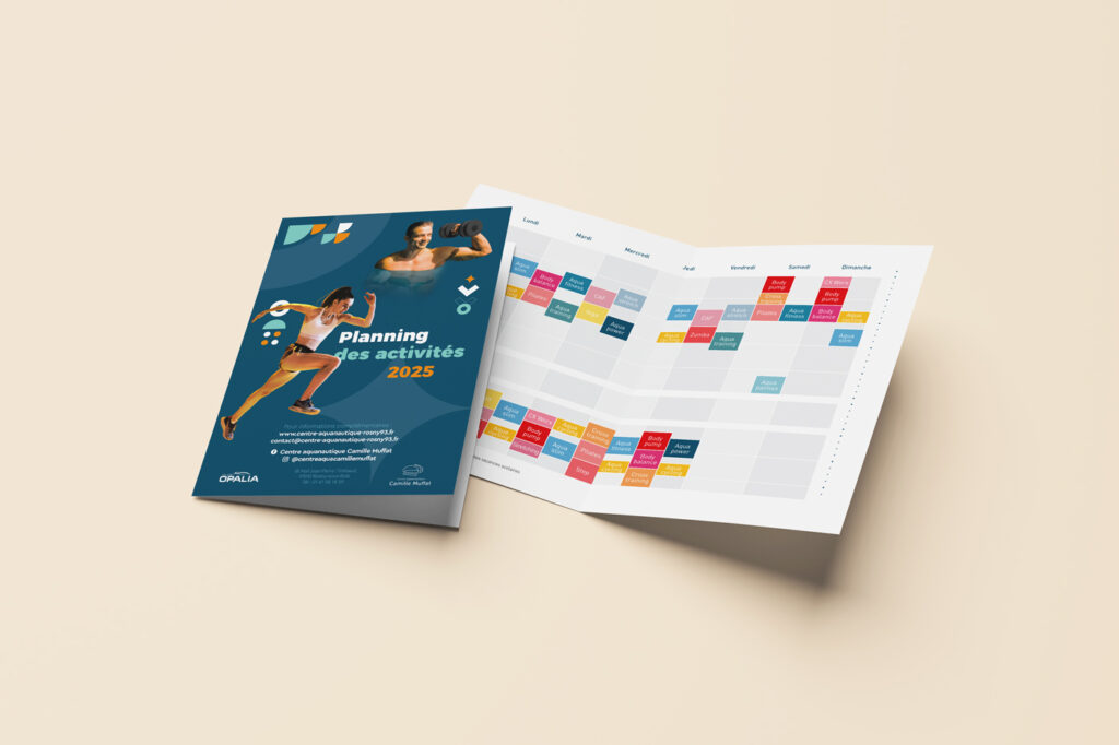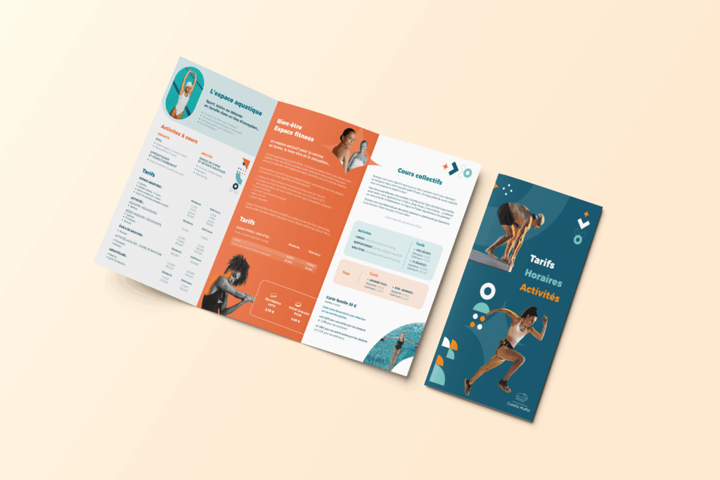 En captant l’esprit dynamique qui caractérise ce lieu, nous avons imaginé l’identité visuelle du centre, mêlant élégance et énergie pour incarner son univers sportif. Cette identité a été déclinée sur tous les supports print : plaquette 3 volets, planning des activités, formulaires d’abonnements, etc.